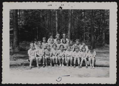 A photographic print of 19 young individuals sitting and standing in three rows outdoors with trees in the background. Most wear button-up shirts with neckerchiefs, some wear striped t-shirts. All individuals appear to be white. "Jun. 55" typed on front."Jun. 55" typed on front.