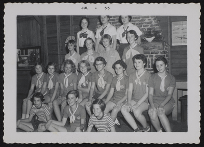 A photographic print of 18 individuals sitting and standing in four rows indoors. Most wear button-up shirts with neckerchiefs, two individuals in the front row wear striped t-shirts. The three individuals in the back row appear to be camp counselors. All individuals appear to be white. "Jun. 55" typed on front."Jul. 55" typed on front.