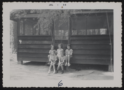 A photographic print of five young individuals sitting in two rows on the steps of a cabin, with the entirety of the front of the cabin visible. All individuals appear to be white. "Jul. 55" typed on front.