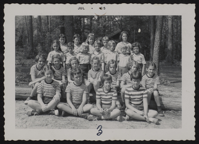 A photographic print of 23 young individuals sitting and standing in four rows outdoors, with trees in the background. The individuals in the first two rows wear striped t-shirts, and those in the back two rows wear button-up short sleeve shirts. All individuals appear to be white. "Jul. 55" typed on front.
