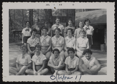 A photographic print 17 individuals sitting and standing in three rows outdoors. Camp structures and trees are visible in the background. A sign reading "Pioneer" is directly behind the back row. All individuals wear button-up short sleeve shirts with neckerchiefs. All individuals appear to be white. "0 (before 1)" handwritten on front. Jul. 55" typed on front.