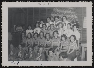 A photographic print of 25 individuals sitting and standing in four rows indoors. Many wear button-up shirts with neckerchiefs, others wear striped t-shirts. Another individual is visible in the background on the left. All individuals appear to be white."#9" handwritten on front. "Jul. 55" typed on front.