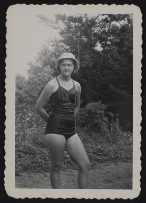 A photographic print of an individual standing outdoors, with trees in the background. They wear a swimsuit and hat. They appear to be white. "'Listen [youse?] kid' – or, 'Caught in the act' – August 25, 1951 Coaquannock" handwritten on back.