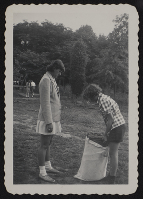 A photographic print of two individuals standing outdoors wearing day clothes, with trees in the background. The individual on the right appears to be packing away a sleeping bag, while the individual on the left looks on. Two other individuals are visible in the distant left background. All individuals appear to be white. "'Ginger peaches' packing duffle, August 29, 1951 Coaquannock [Unit?]" handwritten on back.