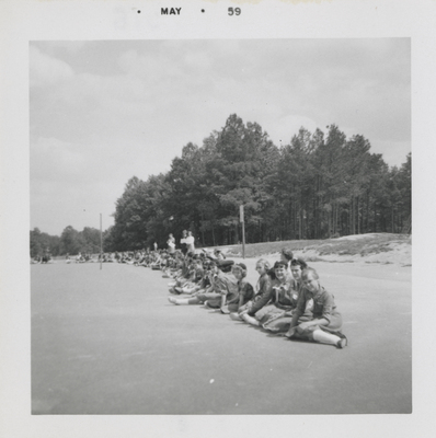 A photographic print of several dozen individuals sitting in a line which stretches from the foreground to the background of the frame. Most appear to wear Girl Scout uniforms. All individuals are presumed to be white. "May 59" typed on front.