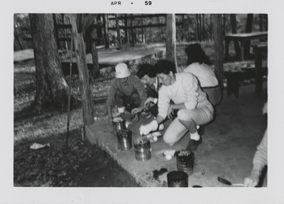A photographic print of four individuals squatting outdoors over what appear to be tin can fires. All individuals appear to be white. The photograph is blurry. "Apr 59" handwritten on back.