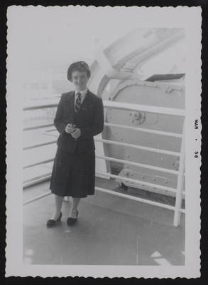A photographic print of an individual in a skirt suit and beret, standing on a platform with water and buildings in the background. The individual appears to be white. "MAR . 56" typed on front.
