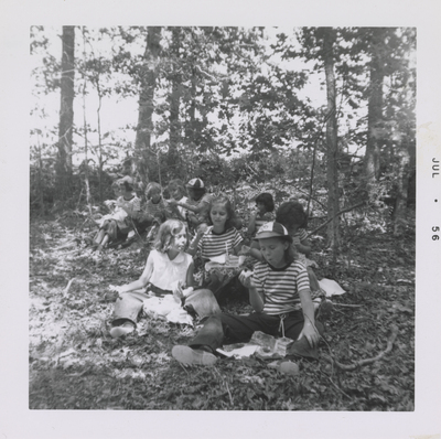 A photographic print of approximately ten young Girl Scouts sitting on the ground outdoors. They appear to be eating a meal. Most wear striped t-shirts, some wear caps. All individuals appear to be white. "JUL . 56" typed on front.