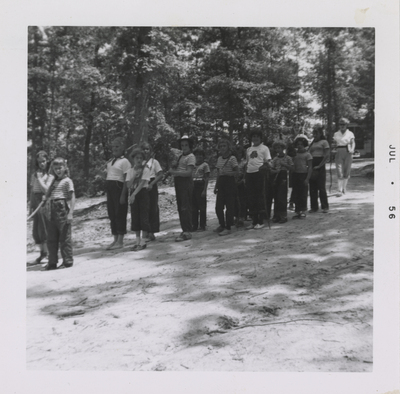 A photographic print of approximately 15 individuals standing in a line in pairs. Most hold sticks over their shoulders and wear striped t-shirts. The individual in the back appears to be a counselor. All individuals appear to be white. "JUL . 56" typed on front.