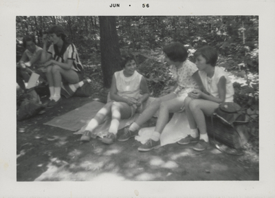 A photographic print of five individuals sitting on logs and on the ground outdoors, with trees in the background. All individuals appear to be white. "Jun . 56" typed on front.