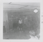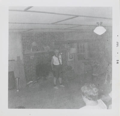 A photographic print of an individual, perhaps in a performance. They stand in front of a fireplace indoors, and several other individuals can be seen at the bottom and right of the photograph looking at the camera. All individuals appear to be white. "JUL. 56" typed on front.