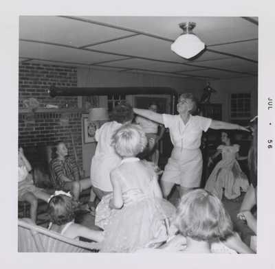 A photographic print of two adult individuals performing. Approximately seven individuals are sitting on the floor and chairs around them, some wear costumes. A fireplace is visible in the background. All individuals appear to be white. JUL . 56" typed on front. "Howdy" handwritten on back.