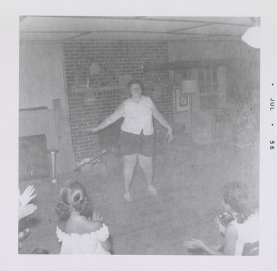 A photographic print of an individual performing. Approximately three individuals are sitting on the floor around them. A fireplace is visible in the background. All individuals appear to be white. "JUL . 56" typed on front.