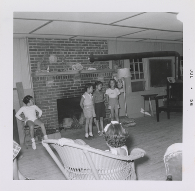 A photographic print of three young individuals performing. Two individuals are sitting in chairs around them. A fireplace is visible in the background. All individuals appear to be white. "JUL . 56" typed on front.