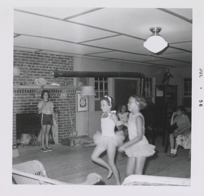 A photographic print of two young individuals performing. They wear costumes and skip while holding hands. Two individuals are standing and sitting in a chair around them. A fireplace is visible in the background. All individuals appear to be white. JUL . 56" typed on front.