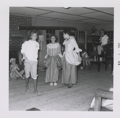 A photographic print of three individuals performing. Two of them wear costumes. FIve individuals are standing and sitting around them. A fireplace is visible in the background. All individuals appear to be white. JUL . 56" typed on front.