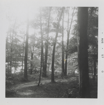 A photographic print of the woods, with trees and a trail visible. "Aug 57" typed on front.