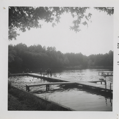 A photographic print of a large dock on a lake, with approximately five individuals standing on it visible from a distance. "Aug 57" typed on front.