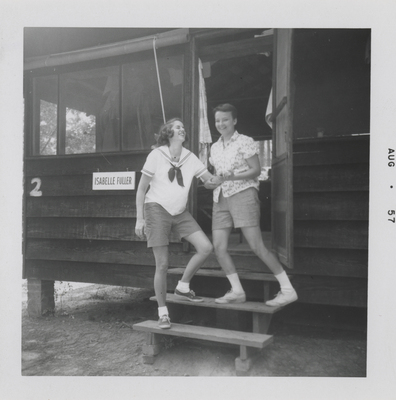 A photographic print of two individuals standing on the steps of a cabin. The cabin has a "2" painted on it, and a sign that reads "Isabelle Fuller." The individual on the left wears a camp uniform, and the one on the right wears day clothes. Both individuals appear to be white. "Aug 57" typed on front.