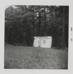 A photographic print of a tree grove with sheets hanging between trees. The sheets have the Girl Scout clover logo painted on them. "Aug 57" typed on front.