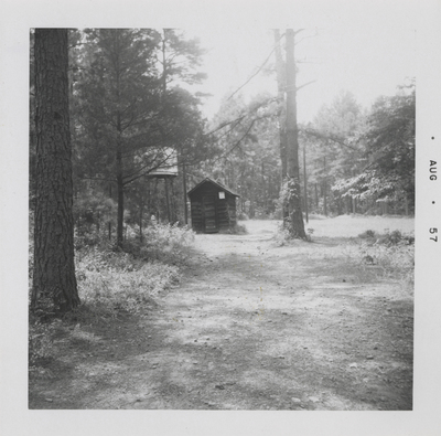 A photographic print of a small cabin, perhaps an outhouse, and a water tower in a field surrounded by trees. "Aug 57" typed on front.