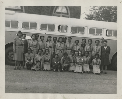 A photographic print of a Girl Scout troop standing and kneeling in two rows outdoors, with a bus behind them and a building partially visible behind that. Approximately twenty-six individuals are visible, most appear to be Girl Scouts wearing uniforms and berets. On either end of the standing row are four individuals who appear to be adults, perhaps troop leaders and/or chaperones. All individuals appear to be Black. The troop number is assumed from a partially visible patch one of the individuals wears. "No. preline not clean enough for publication" handwritten on back. "Property of COMMONWEALTH GIRL SCOUT COUNCIL OF VIRGINIA INCORPORATED 1148 HANOVER GREEN DRIVE MECHANICSVILLE, VIRGINIA 23111" stamped on back.