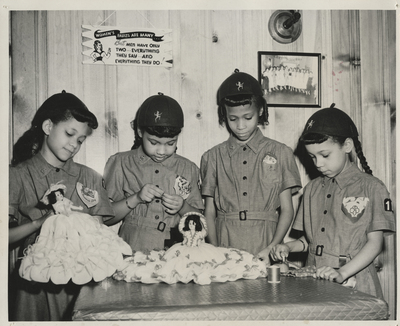 A photographic print of four young individuals standing around a table indoors, wearing Girl Scouts uniforms and caps. They appear to be working on crafting costumes for dolls, with two dolls in large ruffle skirts visible. The dolls appear to be white. On the wall behind them, an sign hangs which reads "Women's Faults Are Many...But Men Have Only Two...Everything They Say...And Everything They Do!" A photograph of individuals at a party also hangs on the wall. All individuals appear to be Black. "1950" handwritten on back. "SCOTT L. HENDERSON PHOTOGRAPHER 1724. Whitcomb St. Richmond, Va. TELEPHONE 2-1115" stamped on back. "Property of COMMONWEALTH GIRL SCOUT COUNCIL OF VIRGINIA, INCORPORATED 1148 HANOVER GREEN DRIVE MECHANICSVILLE, VIRGINIA 23111" stamped on back.