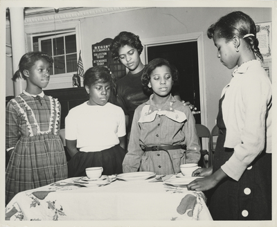 A photographic print of five individuals standing around a table set for tea service indoors. Four young individuals stand directly around the table, with the person second from the right wearing a Girl Scout uniform. An adult individual stands behind them looking on. All individuals appear to be Black. "Scott L Henderson Photographer 618 Overbrook Rd. Richmond, Va. Telephone ELgin 5-1328" stamped on back. "Property of COMMONWEALTH GIRL SCOUT COUNCIL OF VIRGINIA INCORPORATED 1148 HANOVER GREEN DRIVE MECHANICSVILLE, VIRGINIA 23111" stamped on back.