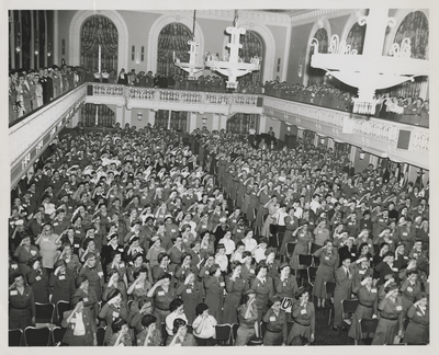 A photographic print of a large hall, with a second floor balcony that wraps around three walls of the hall. Three chandeliers hang down the center of the room, and there are curtains on all the two-story windows. Both the floor of the hall and the balcony is filled with potentially several hundred individuals, most are in some sort of adult Girl Scout uniform, and are saluting. All individuals appear to be white. ""JUDGE" of good pictures industrial photographers 119 Ninth St. PGH. 22, PA. GR. 1-4288 A.T. 1-3834 Reorder Number" stamped on back.