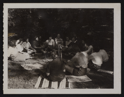 A photographic print of approximately 17 individuals sitting in a circle outdoors around a campfire. Some appear to be roasting marshmallows. Many individuals are difficult to see because of shade from the trees around them. All individuals are presumed to be white.