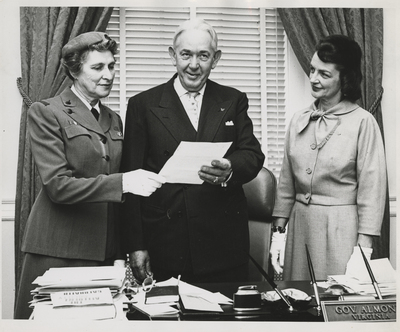A photographic print of three individuals indoors, standing at a desk with a window with shades and curtains behind them. On the left is an adult Girl Scout in uniform, beret, and white gloves. In the center is Virginia Governor James L. Almond, Jr. They both hold onto a piece of paper. On the right is another individual who wears day clothes and white gloves. Both individuals appear to be white.