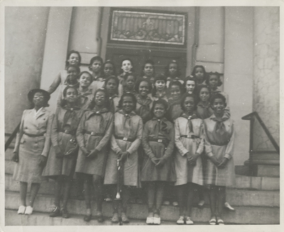 A photographic print of 24 individuals standing in four rows on stairs in front of a building outdoors. There is a stained glass window above the doors behind them. Most individuals wear Girl Scout uniforms, neckerchiefs, and berets. The individual on the left in the front row appears to be the troop leader. All individuals appear to be Black.