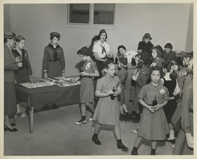 A photographic print of approximately 20 individuals in a room. On the left is a table set up with cookie platters, and three individuals stand around it in various Girl Scout uniforms. A young individual selects a cookie from a tray while holding a glass soda bottle. On the right, a group of young Girl Scouts waits in line for sodas being handed out by individuals behind a bar. All individuals appear to be white. "Cookies and Sodas Social, ca 1950-1959" written on item folder. "From COLONIAL STUDIO 9. E. Grace St. Richmond 19, Va" stamped on back. "For Reorders refer to this number 42049 #5 COLONIAL STUDIOS" stamped on backside. "Girl Scout" handwritten on backside. "GS" written on backside.