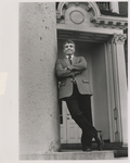 A photographic print of an unnamed VCU administrator or faculty member posing outside in front of a building and next to a pillar.