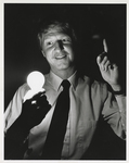 A photographic print of an unnamed VCU administrator or faculty member carrying a lit light bulb in a dark area.