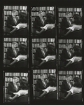 A contact sheet of multiple photographs of an unnamed VCU administrator or faculty member sitting and conversing with an individual in front of a bookshelf.