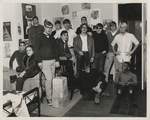 A photographic print of a group of individuals all congregated in a Richmond Professional Institute dorm room and posing for a picture. Three individuals are sitting on a bed, two on the floor, and nine are standing. There are multiple posters on the wall, including hand drawings, a poster of actor W. C. Fields, and a poster that reads "Peace in Vietnam."