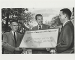 A photographic print of Director of Admissions O.J. Paris and employees N. Harvey Neal and Dr. Mark E. Meadows holding a sign that says, "Virginia Commonwealth University, Admissions Office Financial Aid Office" outdoors.