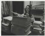 A photographic print of Diane Moore sitting at a table with multiple stacks of files on it.