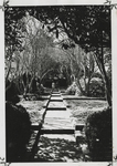 A photographic print of the outdoors at Agecroft Hall, consisting of a walkway and plants with two individuals seen walking through it an arch of trees.
