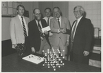 A photographic print of Dr. Roland W. Dwyer, Dr Robert Gowdy, Dr. Donald Shillady, G.R Wainwright, and A. Clifton Lilly Jr. posing for a picture with two of them shaking hands, one carrying a piece of paper, and structures of atoms on a table.