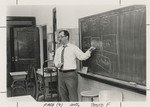 A photographic print of a teacher presenting a lesson on a chalkboard, part of an Adopt a School program.