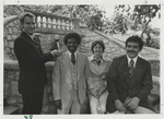 A photographic print of four unnamed VCU administrators standing outside near a stairwell and fountain.
