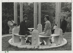 A photographic print of four unnamed VCU administrators sitting around a gazebo with benches and pillars.
