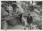 A photographic print of four unnamed VCU administrators standing near a waterfall.
