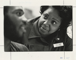 A photographic print focused on the face of Dr. Claudette McDaniel, who wears a name tag which also reads "Section Chief, Special Activities." She looks at another individual who is out of focus. McDaniel worked in Therapeutic Recreation for the VCU Health System. She was also the first Black woman to serve as vice mayor in the city of Richmond.