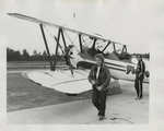 A photographic print of two individuals standing near an airplane in an open field with a pilot seen sitting in the airplane.