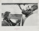 A photographic print of an individual standing and talking to a pilot sitting on an airplane.