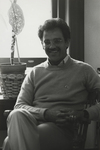 A photographic print of an individual sitting near a table with a plant in a pot on it. Originally in the subject folder labeled "Airplanes."