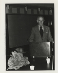 A photographic print of an individual wearing a suit and tie standing in front of an open briefcase with a coat, hat, and two cups on the table, presumably in an auditorium or classroom.